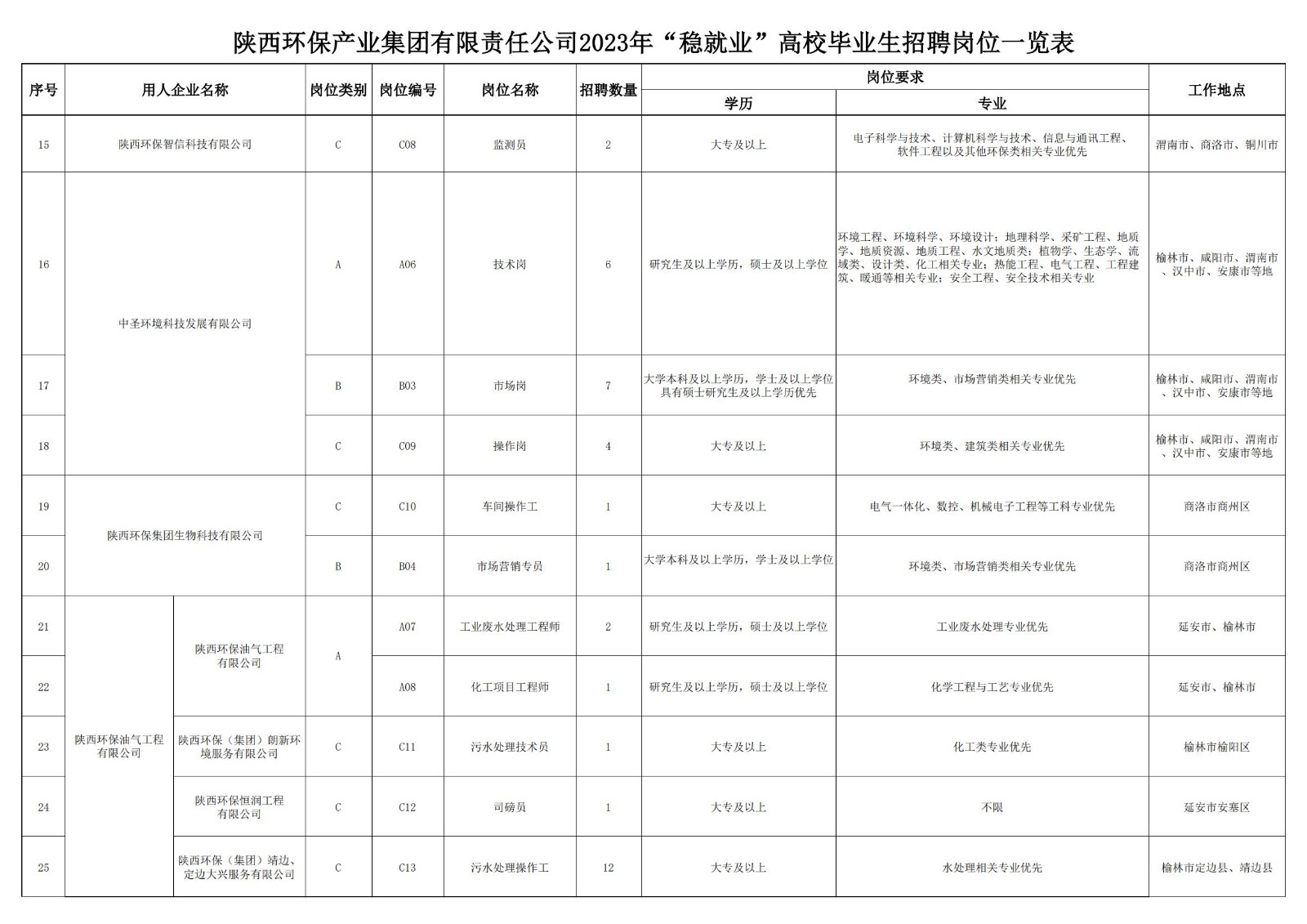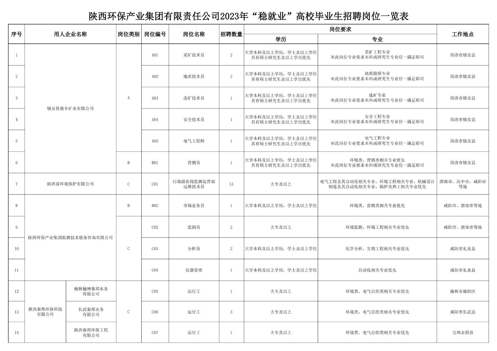 (二)岗位类别 本次招聘3个类别岗位: 1.A类:专业技术类岗位 2.B类:市场营销类岗位 3.C类:技能操作类岗位 (三)招聘岗位及任职条件: 招聘岗位及任职条件详见附件;部分岗位须与用人企业约定同类型岗位服务年限。 三、招聘程序 本次社会公开招聘按照发布招聘公告→报名及资格初审→笔试→现场资格复审→面试→体检→公示及录用等程序进行。 (一)发布招聘公告 1.j9九游会集团官网(//nymcjx.com) 2.智联招聘西安频道() 3.陕西公共招聘网( (二)报名及资格初审 1.公告发布及报名时间:2023年8月18日14:00-2023年8月23日 17:00 2.报名网站://sxhbjtzp.zhaopin.com 3.报名方式: (1)本次招聘采取线上报名及资格初审方式,不设现场报名,不接受简历邮递、面呈等方式。 (2)应聘人员须根据报名系统要求仔细填写信息,上传相应材料,避免因个人原因导致报名不成功。 4.应聘人员在报名系统中须正确上传所需资料,具体如下: (1)本人近期免冠正面证件照; (2)身份证正反面或其他有效身份证件扫描件; (3)所有学历证、学位证原件电子版(国(境)外学历须上传教育部留学服务中心认证的《国内外学历学位认证书》); (4)招聘岗位任职条件要求的其他证明材料扫描件。 5.A类岗位原则上采用笔试与面试相结合的方式进行考核;B类、C类岗位原则上采用面试方式进行考核,具体考核方式以实际情况为准。 6.其他要求: (1)资格初审上传资料与填报的报名信息须保持一致,若其中一项不符合报考岗位所需要求,视为线上资格初审不通过; (2)应聘人员相关材料必须真实可靠。因报名提交资料不真实、不完整或错误遗漏,造成报名无效、资格初审及后续资格审查不通过等后果的,由应聘人员自行承担责任; (3)为确保报名成功,建议应聘人员在PC(电脑)端进行报名操作; (4)资格初审结果不作为确定符合岗位条件的最终依据,资格审查贯穿招聘工作全过程。凡在招聘工作各个环节中发现报考者不符合岗位条件或存在弄虚作假等问题的,一经查实,取消报考(录用)资格,已经录用的解除劳动合同并追究相关法律责任。 (三)笔试 1.通过资格初审的应聘人员,进入笔试环节; 2.笔试主要考核应聘者综合素质; 3.笔试时间、地点另行通知; 4.应聘人员须在指定时间内登录报名网站下载打印准考证,未按时打印准考证者视为主动放弃。 (四)现场资格复审 根据笔试成绩排名,确定进入资格复审环节的应聘人员,招聘企业现场对所提交的资料真实性进行核验。 (五)面试 1.通过资格复审的应聘人员,进入面试环节; 2.面试主要考核应聘者专业素质; 3.面试时间、地点另行通知; 4.面试结束后,根据综合成绩从高到低确定拟录用人员。 (六)公示 对拟录用人员进行公示。 (七)体检 公示结束后,各用人企业组织拟录用人员进行体检,体检费用由拟录用人员自理。体检不合格的,取消应聘资格。 (八)递补 如出现应聘人员未参加体检、体检不合格、放弃录用等情况,由招聘企业决定是否递补。 (九)录用 对体检合格的拟录用人员按有关规定办理录用手续。 四、注意事项 (一)应聘者应对本人所填报资料的真实性负责,诚实应聘。对伪造、涂改证件证明,或以其他不正当手段获取应聘资格、在考核过程中作弊等违反公开招聘纪律的应聘人员,将取消应聘资格,对已录用人员,一经查实,即予解除劳动关系。 (二)本次招聘不指定教材和辅导用书,不举办也不委托任何机构和个人举办考试辅导培训班。 (三)应聘人员报名时须提交能及时联系到本人的电话号码,以便在出现递补情形时联系本人。因个人原因无法取得联系造成的后果,由个人自行负责。应聘人员报名成功后,请时刻关注公告发布网站上的有关资格复审、考试及其它相关信息,以免错过时间节点。